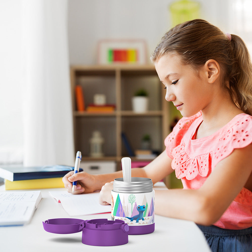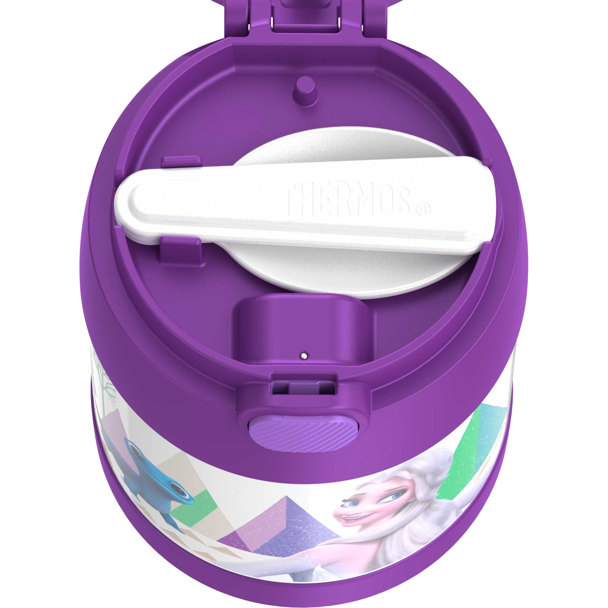 The 10oz FUNtainer® Food Jar from Thermos® brand is vacuum insulated to keep hot foods hot and cold foods cold-and since it’s designed for kids it’s also colorful and fun. Send them to school with their favorite soup so they can enjoy it fresh and hot at lunch time. If they’re in the mood for a cold snack. pack it up with yogurt and berries. or apples and peanut butter. The FUNtainer food jar is light weight and compact with a push button lid so it’s easy to carry and open. To clean. you can pop your FUNtainer food jar in the dishwasher; however washing by hand is recommended. Spoon included.